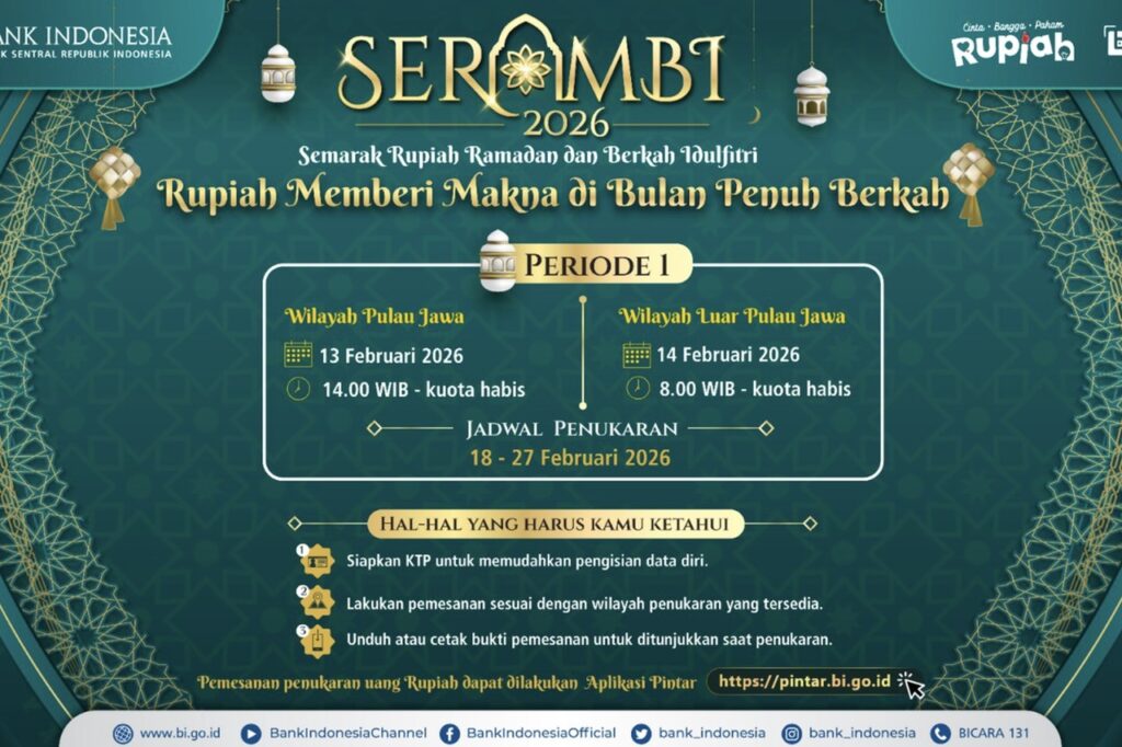 Bank Indonesia (BI) resmi membuka layanan penukaran uang baru untuk menyambut Ramadan dan Idulfitri 2026 melalui program Semarak Rupiah Ramadhan dan Berkah Idul Fitri (Serambi). Masyarakat kini dapat melakukan pemesanan secara daring melalui aplikasi PINTAR BI guna memastikan proses penukaran berjalan tertib dan terencana.