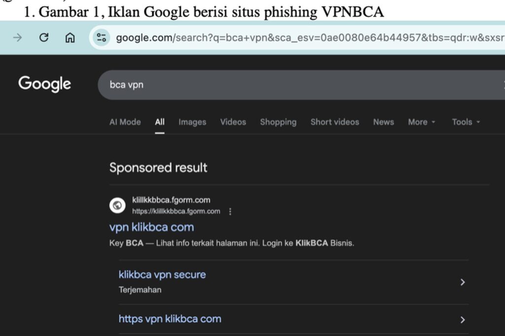 Lini masa media sosial diramaikan dengan peringatan warganet mengenai tautan phishing yang mengatasnamakan VPN KlikBCA. Tautan berbahaya ini disebut muncul melalui iklan Google, menempatkannya di posisi teratas hasil pencarian. Pelaku memanfaatkan iklan berbayar agar situs palsu yang mereka buat tampak menyerupai layanan resmi VPN KlikBCA dan terlihat meyakinkan.