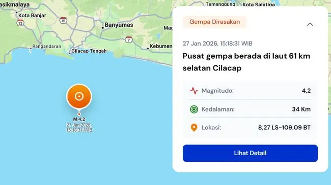 Gempa bumi berkekuatan magnitudo 4,2 mengguncang wilayah Kabupaten Cilacap, Jawa Tengah, pada Selasa (27/1/2026) pukul 15.18 WIB. Badan Meteorologi, Klimatologi, dan Geofisika (BMKG) mengonfirmasi pusat gempa berada di perairan selatan Jawa dengan kedalaman 34 kilometer.