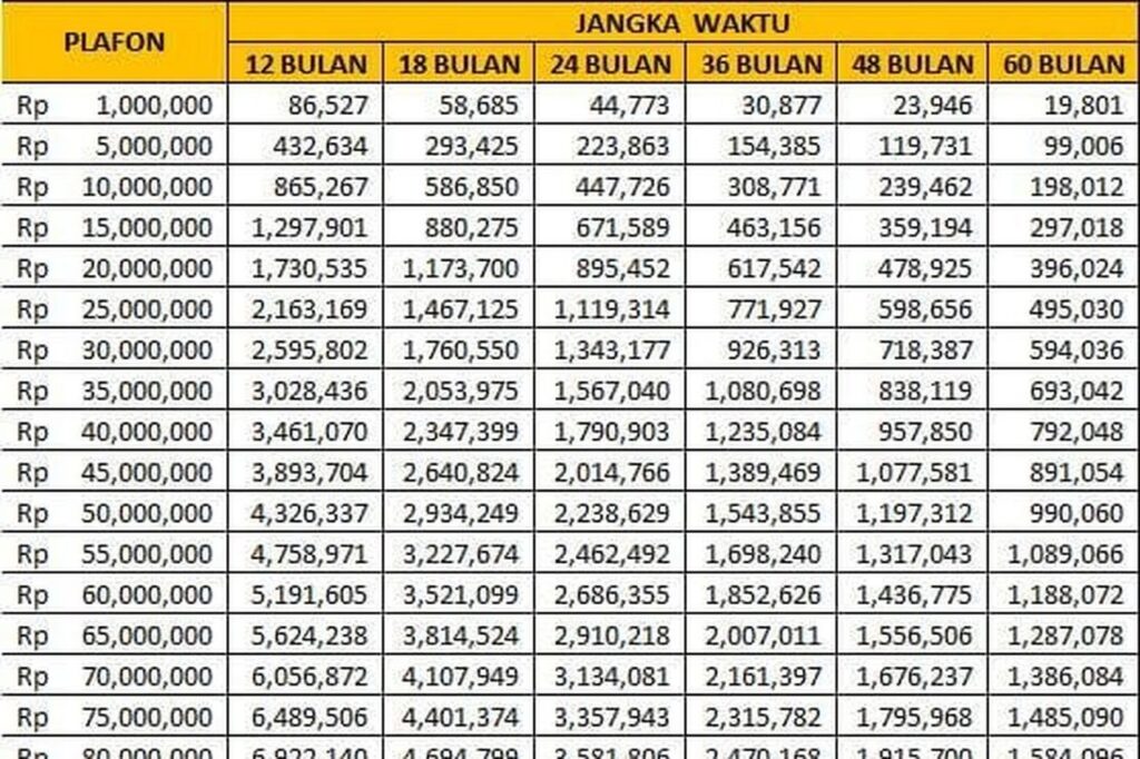 Berdasarkan simulasi terbaru, pinjaman dengan nominal Rp 90.000.000 memiliki beragam pilihan jangka waktu pengembalian. Berikut adalah rincian estimasi angsuran per bulan untuk plafon tersebut: