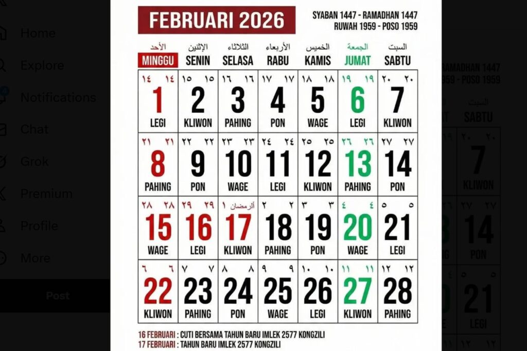 Narasi ini bermula dari unggahan pengguna X yang menyebut bahwa Februari 2026 memiliki komposisi empat hari untuk setiap nama hari, mulai dari Senin hingga Minggu. Fenomena ini diklaim hanya terjadi sekali dalam 823 tahun, sebuah pernyataan yang kemudian menarik perhatian luas, termasuk dari pemilik platform X, Elon Musk, yang turut membagikan tangkapan layar kalender tersebut.