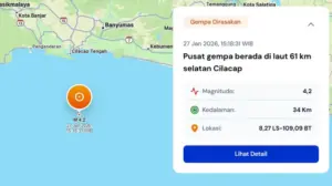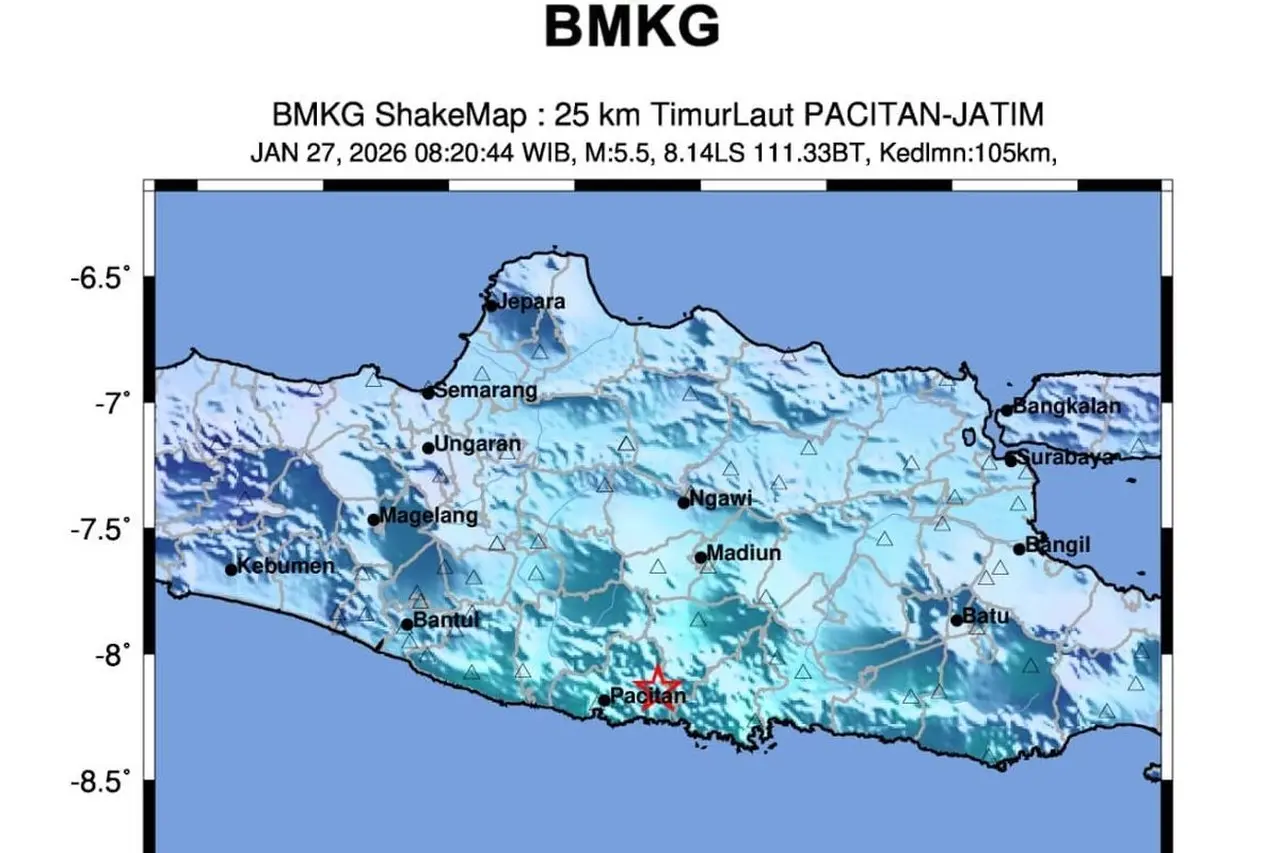 Gempa bumi berkekuatan magnitudo 5,7 mengguncang wilayah Pacitan, Jawa Timur, pada Selasa (27/1/2026) pukul 08.20 WIB. Badan Meteorologi, Klimatologi, dan Geofisika (BMKG) melaporkan bahwa pusat gempa berada di koordinat 8,8 Lintang Selatan dan 111,33 Bujur Timur, atau sekitar 24 kilometer timur laut Pacitan dengan kedalaman 122 kilometer.