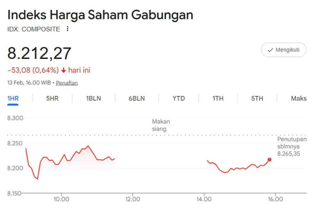 Indeks Harga Saham Gabungan (IHSG) mengakhiri perdagangan pekan ini dengan berada di zona merah pada Jumat (13/2/2026). Indeks tercatat mengalami penurunan sebesar 53,08 poin atau 0,64 persen sehingga parkir di level 8.212,27.