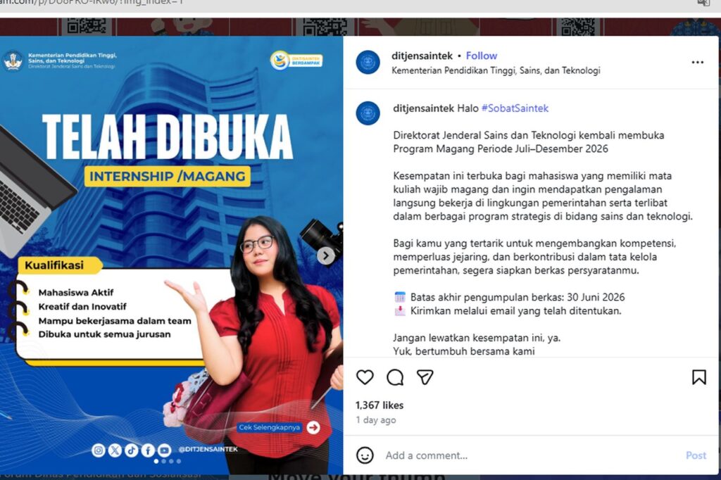 Kesempatan magang ini diumumkan melalui akun Instagram resmi @ditjensaintek pada Minggu, 22 Februari 2026. Dalam pengumuman tersebut, Ditjen Saintek menegaskan komitmennya untuk melibatkan generasi muda dalam program-program strategis.
