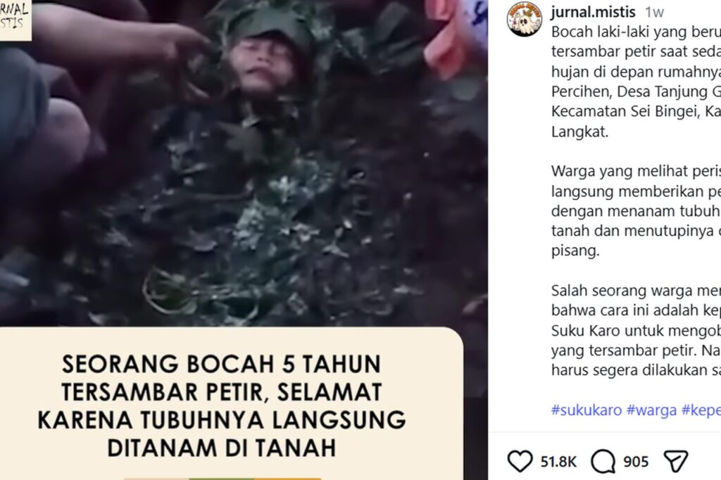 Sebuah unggahan video di media sosial yang memperlihatkan seorang anak diduga tersambar petir lalu dikuburkan ke dalam tanah memicu perdebatan warganet. Narasi yang menyertai video tersebut mengklaim bahwa cara ini dapat menyelamatkan korban sambaran petir, yang kemudian viral pada Minggu, 18 Januari 2026.