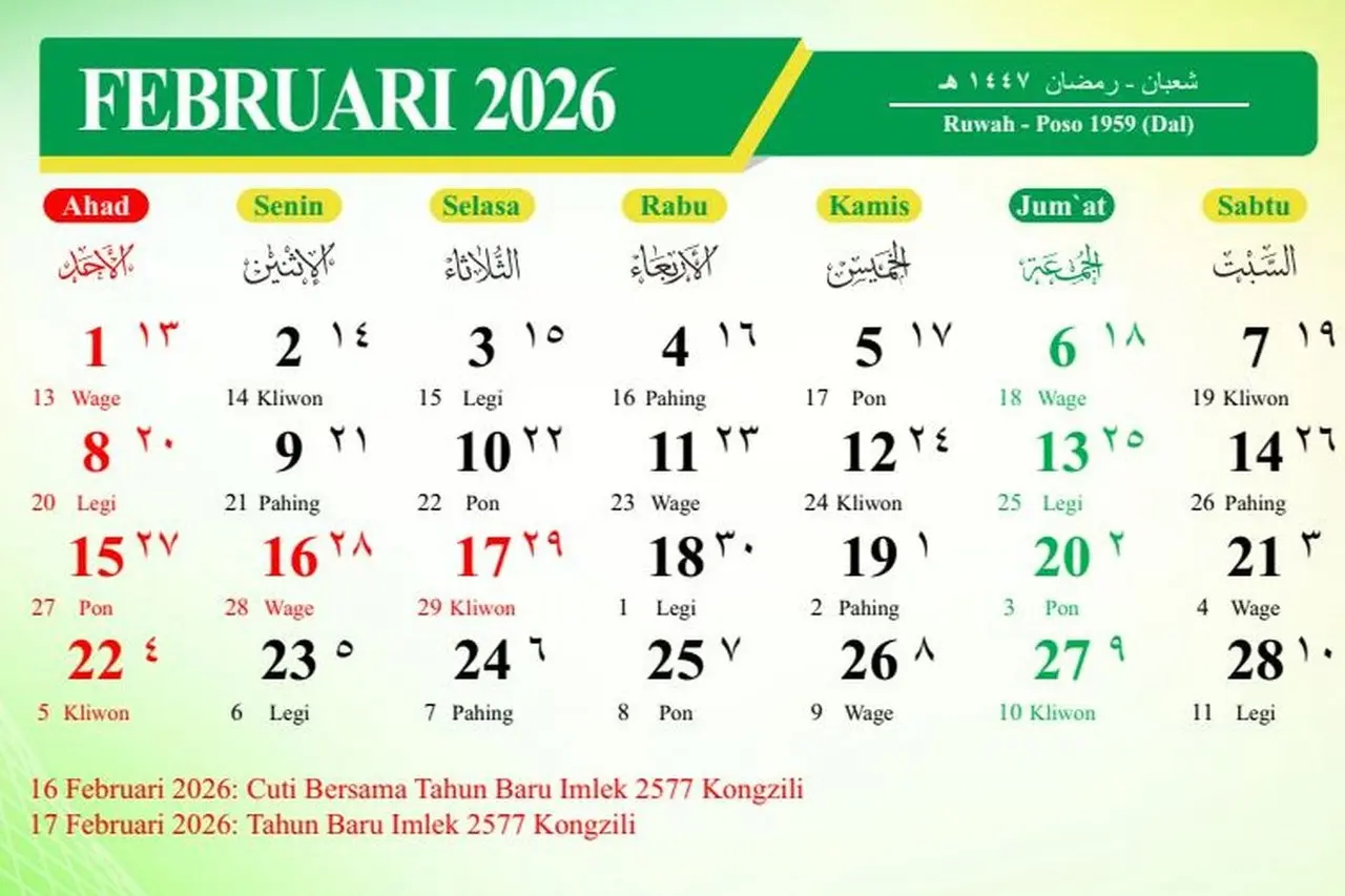 Adapun susunan long weekend Februari 2026 adalah sebagai berikut: