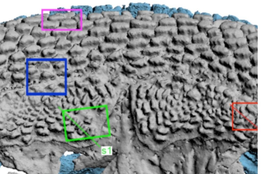 Hasil pemindaian mengungkap adanya odontodes, yaitu benjolan jaringan keras yang mengalami mineralisasi. Lapisan ini tumbuh bertahap dan bahkan dapat menutupi gigi yang rusak. Selain itu, ditemukan bercak mineral ekstra keras yang diduga berfungsi untuk membantu ikan menghancurkan mangsa bercangkang keras.