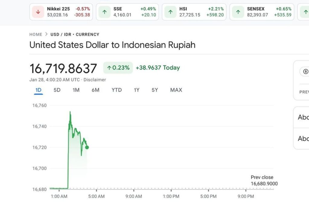 Nilai tukar rupiah terhadap dolar Amerika Serikat (AS) menunjukkan tren penguatan pada Rabu, 28 Januari 2026, setelah sempat tertekan. Mata uang Indonesia ini merangkak tipis 0,23 persen ke level Rp 16.719 per dolar AS pada pukul 11.02 WIB, posisi yang lebih kuat dibandingkan penutupan perdagangan hari sebelumnya di angka Rp 16.768 per dolar AS.