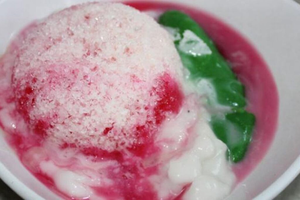 - Susun bahan isian dalam mangkuk. Tambahkan es batu, siram kuah santan, lalu beri sirup.