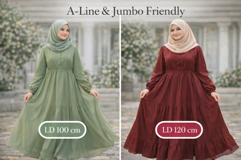 - Gamis A-Line: Memiliki siluet mengecil di atas dan melebar ke bawah, membantu menyeimbangkan bahu dan pinggul tanpa menonjolkan area perut.