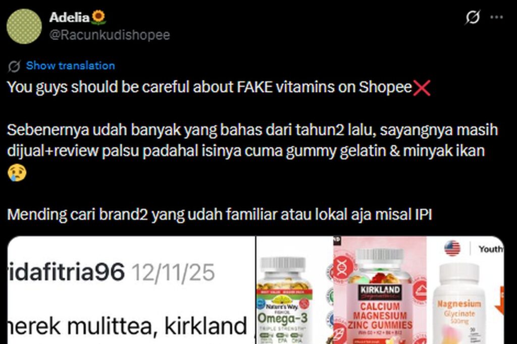 Sebuah unggahan di media sosial X mendadak viral setelah mengeklaim adanya peredaran produk vitamin palsu di berbagai platform marketplace. Unggahan tersebut memperingatkan konsumen untuk waspada terhadap produk yang hanya berisi gelatin dan minyak ikan, meski dipasarkan sebagai produk asli.